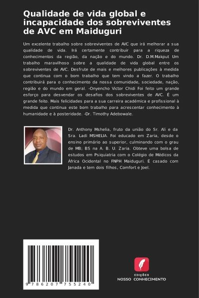 Um excelente trabalho sobre sobreviventes de AVC que irá melhorar a sua qualidade de vida. Irá certamente contribuir para a riqueza de conhecimentos da região, da nação e do mundo. Dr. D.M.Makput Um trabalho maravilhoso sobre a qualidade de vida global entre os sobreviventes de AVC. Desfrute de mais e melhores publicações à medida que continua com o bom trabalho que tem vindo a fazer. O trabalho contribuirá para o conhecimento da nossa comunidade, sociedade, nação, região e do mundo em geral. -Onyencho Victor Chidi Foi feito um grande esforço para desvendar os desafios dos sobreviventes de AVC. É um grande feito. Mais felicidades para a sua carreira académica e profissional à medida que continua este bom trabalho para acrescentar conhecimento à humanidade e à posteridade. -Dr. Timothy Adebowale.