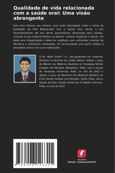 Este livro oferece aos leitores uma visão abrangente sobre o tema da Qualidade de Vida Relacionada com a Saúde Oral, desde o seu desenvolvimento até aos vários questionários disponíveis para adultos, crianças e com especial ênfase no género, crianças especiais e idosos. Foi dada uma categorização a todos os subtítulos com suficientes revisões da literatura e referências adequadas. Foi acrescentada uma parte relativa à perspetiva futura e às suas implicações.