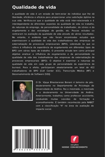 A qualidade de vida é um estado de bem-estar do indivíduo que lhe dá liberdade, eficiência e eficácia para proporcionar uma satisfação óptima na sua vida. Verificou-se que a qualidade de vida está inter-relacionada e é interdependente de diferentes aspectos da qualidade de vida no trabalho, da natureza do emprego, da personalidade do trabalhador, do stress e do esgotamento e das estratégias de gestão, etc. Poucos estudos se centraram na avaliação da qualidade de vida através de vários resultados. No entanto, é evidente que não foram encontrados estudos que examinassem a qualidade de vida dos trabalhadores das empresas de externalização de processos empresariais (BPO), sobretudo no que se refere à influência da experiência de esgotamento em diferentes tipos de BPO com vários tipos de trabalho. O presente estudo tem como principal objetivo analisar a influência do esgotamento e da personalidade na qualidade de vida dos trabalhadores das empresas de externalização de processos empresariais (BPO). O objetivo é examinar a natureza da qualidade de vida em cada grupo de personalidade da experiência de burnout. Para o efeito, participaram aleatoriamente um total de 422 trabalhadores de BPO [Call Center (CC), Transcrição Médica (MT) e Desenvolvimento de Software (SD)].