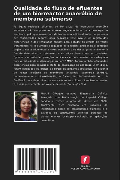 As águas residuais efluentes do biorreactor de membrana anaeróbia submersa não cumprem as normas regulamentares para descarga no ambiente, pelo que necessitam de tratamento adicional antes de poderem ser consideradas seguras para descarga. Este livro é um registo das experiências e dos resultados obtidos para estudar os efeitos de vários tratamentos físico-químicos adequados para reduzir ainda mais o conteúdo orgânico deste efluente para níveis aceitáveis para descarga no ambiente, a fim de determinar o tratamento mais eficaz, bem como as condições óptimas e o modo de operações, a cinética e o adsorvente mais adequado para a redução da matéria orgânica num SAMBR. Foram também efectuadas experiências para estudar o efeito da coagulação na adsorção. Além disso, foram estudados os efeitos de certos plastificantes presentes no efluente do reator biológico de membrana anaeróbia submersa (SAMBR), nomeadamente o hidroxilbifenilo, o ftalato de bis-2-etil-hexilo e o 2-fenilfenol, para determinar os seus efeitos na cultura microbiana no reator e, subsequentemente, no volume de produção de gás CH4.