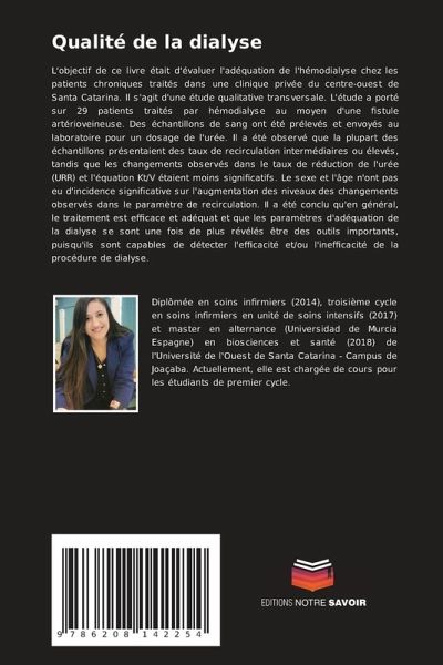 L'objectif de ce livre était d'évaluer l'adéquation de l'hémodialyse chez les patients chroniques traités dans une clinique privée du centre-ouest de Santa Catarina. Il s'agit d'une étude qualitative transversale. L'étude a porté sur 29 patients traités par hémodialyse au moyen d'une fistule artérioveineuse. Des échantillons de sang ont été prélevés et envoyés au laboratoire pour un dosage de l'urée. Il a été observé que la plupart des échantillons présentaient des taux de recirculation intermédiaires ou élevés, tandis que les changements observés dans le taux de réduction de l'urée (URR) et l'équation Kt/V étaient moins significatifs. Le sexe et l'âge n'ont pas eu d'incidence significative sur l'augmentation des niveaux des changements observés dans le paramètre de recirculation. Il a été conclu qu'en général, le traitement est efficace et adéquat et que les paramètres d'adéquation de la dialyse se sont une fois de plus révélés être des outils importants, puisqu'ils sont capables de détecter l'efficacité et/ou l'inefficacité de la procédure de dialyse.