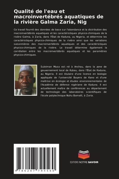 Ce travail fournit des données de base sur l'abondance et la distribution des macroinvertébrés aquatiques et les caractéristiques physico-chimiques de la rivière Galma, à Zaria, dans l'État de Kaduna, au Nigeria, et détermine les caractéristiques physico-chimiques de la rivière ainsi que les variations saisonnières des macroinvertébrés aquatiques et des caractéristiques physico-chimiques de la rivière. Le travail détermine également la corrélation entre les macroinvertébrés aquatiques et les paramètres physico-chimiques.