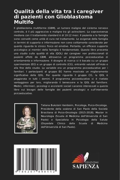 Il glioblastoma multiforme (GBM), un tumore maligno del sistema nervoso centrale, è il più aggressivo e maligno tra gli astrocitomi. La sopravvivenza mediana con il trattamento standard è di 10-12 mesi. Il paziente e la famiglia sono coinvolti come unità di cura nel trattamento. Le esigenze della famiglia in termini di supporto e informazione non sono solitamente considerate per quanto riguarda lo stress fisico ed emotivo. Pertanto, un efficace supporto psicologico ai membri della famiglia è fondamentale. Questo libro presenta uno studio sulla qualità di vita (QOL) dei caregiver non professionali di pazienti affetti da GBM, attraverso un programma psicoeducativo di orientamento e informazione. Il disegno di ricerca si è basato su un gruppo sperimentale (EG) e un gruppo di controllo (CG), entrambi valutati all'inizio e alla fine dello studio. La variabile era un programma psicoeducativo per i familiari. I partecipanti al gruppo EG hanno mostrato un miglioramento significativo della QOL. Per quanto riguarda il gruppo CG, la QOL è peggiorata in tutti i domini. Il programma psicoeducativo si è rivelato vantaggioso per loro, migliorando il benessere e la QOL del familiare. Medici, infermieri, psicologi e assistenti sociali saranno interessati a questo libro sui bisogni delle famiglie dei pazienti oncologici e sull'intervento psicoeducativo.