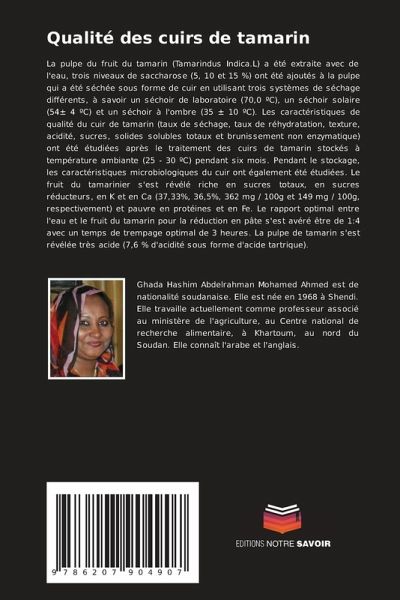 La pulpe du fruit du tamarin (Tamarindus Indica.L) a été extraite avec de l'eau, trois niveaux de saccharose (5, 10 et 15 %) ont été ajoutés à la pulpe qui a été séchée sous forme de cuir en utilisant trois systèmes de séchage différents, à savoir un séchoir de laboratoire (70,0 ºC), un séchoir solaire (54± 4 ºC) et un séchoir à l'ombre (35 ± 10 ºC). Les caractéristiques de qualité du cuir de tamarin (taux de séchage, taux de réhydratation, texture, acidité, sucres, solides solubles totaux et brunissement non enzymatique) ont été étudiées après le traitement des cuirs de tamarin stockés à température ambiante (25 - 30 ºC) pendant six mois. Pendant le stockage, les caractéristiques microbiologiques du cuir ont également été étudiées. Le fruit du tamarinier s'est révélé riche en sucres totaux, en sucres réducteurs, en K et en Ca (37,33%, 36,5%, 362 mg / 100g et 149 mg / 100g, respectivement) et pauvre en protéines et en Fe. Le rapport optimal entre l'eau et le fruit du tamarin pour la réduction en pâte s'est avéré être de 1:4 avec un temps de trempage optimal de 3 heures. La pulpe de tamarin s'est révélée très acide (7,6 % d'acidité sous forme d'acide tartrique).