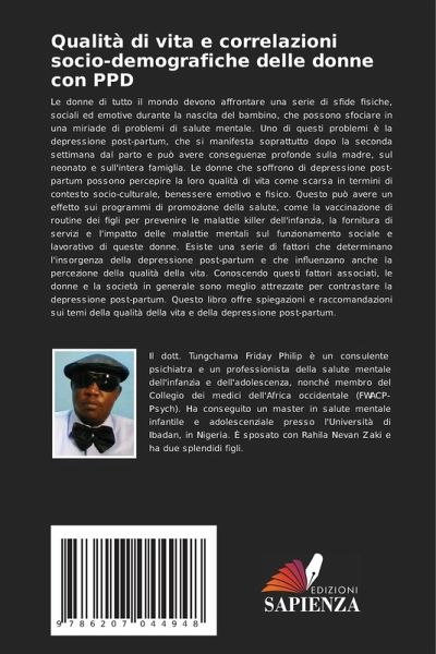 Le donne di tutto il mondo devono affrontare una serie di sfide fisiche, sociali ed emotive durante la nascita del bambino, che possono sfociare in una miriade di problemi di salute mentale. Uno di questi problemi è la depressione post-partum, che si manifesta soprattutto dopo la seconda settimana dal parto e può avere conseguenze profonde sulla madre, sul neonato e sull'intera famiglia. Le donne che soffrono di depressione post-partum possono percepire la loro qualità di vita come scarsa in termini di contesto socio-culturale, benessere emotivo e fisico. Questo può avere un effetto sui programmi di promozione della salute, come la vaccinazione di routine dei figli per prevenire le malattie killer dell'infanzia, la fornitura di servizi e l'impatto delle malattie mentali sul funzionamento sociale e lavorativo di queste donne. Esiste una serie di fattori che determinano l'insorgenza della depressione post-partum e che influenzano anche la percezione della qualità della vita. Conoscendo questi fattori associati, le donne e la società in generale sono meglio attrezzate per contrastare la depressione post-partum. Questo libro offre spiegazioni e raccomandazioni sui temi della qualità della vita e della depressione post-partum.