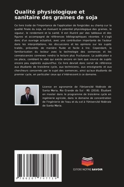 Ce livre traite de l'importance de l'application de fongicides au champ sur la qualité finale du soja, en évaluant le potentiel physiologique des graines, la vigueur, le rendement et la santé. Il est illustré par des tableaux et des figures et accompagné de références bibliographiques récentes. Il s'agit donc d'un ouvrage actualisé, avec une contribution importante de l'auteur dans les interprétations, les discussions et les opinions sur les sujets traités, présentés de manière fluide et facile à lire. Cependant, la familiarisation du lecteur avec la technologie des semences et les connaissances connexes rendra la lecture plus fructueuse. La publication a sa place, comblant le vide qui existe encore en tant que source de sujets encore peu explorés aujourd'hui. Ce livre devrait donc servir de référence aux étudiants de troisième cycle, aux techniciens, aux enseignants et aux chercheurs concernés par le sujet des semences, ainsi qu'aux étudiants de premier cycle, en particulier ceux qui s'intéressent à ce domaine.
