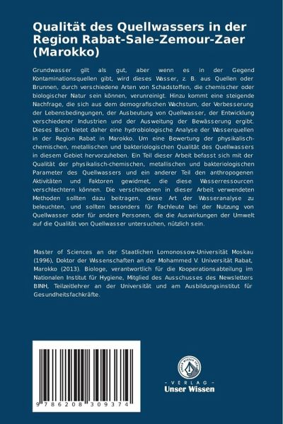 Grundwasser gilt als gut, aber wenn es in der Gegend Kontaminationsquellen gibt, wird dieses Wasser, z. B. aus Quellen oder Brunnen, durch verschiedene Arten von Schadstoffen, die chemischer oder biologischer Natur sein können, verunreinigt. Hinzu kommt eine steigende Nachfrage, die sich aus dem demografischen Wachstum, der Verbesserung der Lebensbedingungen, der Ausbeutung von Quellwasser, der Entwicklung verschiedener Industrien und der Ausweitung der Bewässerung ergibt. Dieses Buch bietet daher eine hydrobiologische Analyse der Wasserquellen in der Region Rabat in Marokko. Um eine Bewertung der physikalisch-chemischen, metallischen und bakteriologischen Qualität des Quellwassers in diesem Gebiet hervorzuheben. Ein Teil dieser Arbeit befasst sich mit der Qualität der physikalisch-chemischen, metallischen und bakteriologischen Parameter des Quellwassers und ein anderer Teil den anthropogenen Aktivitäten und Faktoren gewidmet, die diese Wasserressourcen verschlechtern können. Dieverschiedenen in dieser Arbeit verwendeten Methoden sollten dazu beitragen, diese Art der Wasseranalyse zu beleuchten, und sollten besonders für Fachleute bei der Nutzung von Quellwasser oder für andere Personen, die die Auswirkungen der Umwelt auf die Qualität von Quellwasser untersuchen, nützlich sein.