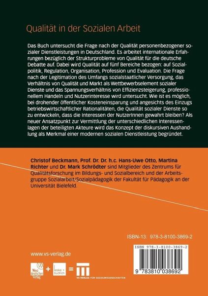 Das Buch untersucht die Frage nach der Qualität personenbezogener sozialer Dienstleistungen in Deutschland. Es arbeitet internationale Erfahrungen bezüglich der Strukturprobleme von Qualität für die deutsche Debatte auf. Dabei wird Qualität auf fünf Bereiche bezogen: auf Sozialpolitik, Regulation, Organisation, Profession und Evaluation. Die Frage nach der Legitimation des Umfangs sozialstaatlicher Versorgung, das Verhältnis von Qualität und Markt als Wettbewerbselement sozialer Dienste und das Spannungsverhältnis von Effizienzsteigerung, professionellem Handeln und Nutzerinteresse wird untersucht. Wie ist es möglich, bei drohender öffentlicher Kosteneinsparung und angesichts des Einzugs betriebswirtschaftlicher Rationalitäten, die Qualität sozialer Dienste so zu entwickeln, dass die Interessen der NutzerInnen gewahrt bleiben? Als neuer Ansatzpunkt zur Vermittlung der unterschiedlichen Interessenlagen der beteiligten Akteure wird das Konzept der diskursiven Aushandlung als Merkmal einer modernen sozialen Dienstleistung begründet.