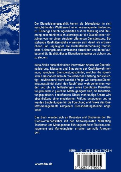 Katja Zielke entwickelt einen innovativen Ansatz zur Operationalisierung, Messung und Steuerung der Qualitätswahrnehmung komplexer Dienstleistungsbündel, welcher die spezifischen Besonderheiten der touristischen Leistung berücksichtigt. Im Mittelpunkt steht dabei die Frage, wie komplexe Dienstleistungsbündel durch den Nachfrager wahrgenommen werden und ob alle Teilleistungen eines komplexen Dienstleistungsbündels in gleichem Maße geeignet sind, die Dienstleistungsqualität zu beeinflussen. Dieser mehrstufige Ansatz wird abschließend einer empirischen Prüfung unterzogen und es werden Empfehlungen für die Forschung und Praxis des Qualitätsmanagements komplexer Dienstleistungsbündel abgeleitet.
