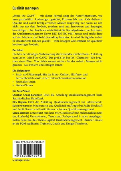 "Mind the GAPZ" - mit dieser Formel zeigt das Autorenteam, wie man ganzheitlich Änderungen gestaltet, Prozesse lebt und Ziele definiert. Qualität und damit Erfolg erreichen Medien langfristig nur, wenn sie sich nicht nur mit dem Produkt, sondern auch mit Strukturen und Strategien beschäftigen. Das Handbuch kristallisiert die Grundgedanken und Leitlinien der Qualitätsmanagement-Norm DIN EN ISO 9001 heraus und bricht diese auf den Medien- und Redaktionsalltag herunter. So wird die tägliche Arbeit in strukturierte Bahnen gelenkt - trotz knapper Zeit entsteht ein qualitativ hochwertiges Produkt.