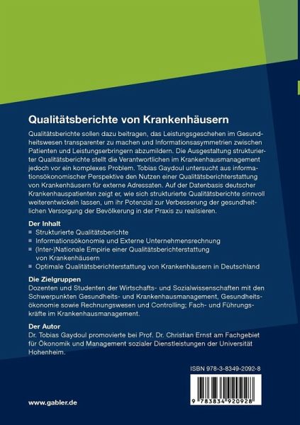 Qualitätsberichte sollen dazu beitragen, das Leistungsgeschehen im Gesundheitswesen transparenter zu machen und Informationsasymmetrien zwischen Patienten und Leistungserbringern abzumildern. Die Ausgestaltung strukturierter Qualitätsberichte stellt die Verantwortlichen im Krankenhausmanagement jedoch vor ein komplexes Problem. Tobias Gaydoul untersucht aus informationsökonomischer Perspektive den Nutzen einer Qualitätsberichterstattung von Krankenhäusern für externe Adressaten. Auf der Datenbasis deutscher Krankenhauspatienten zeigt er, wie sich strukturierte Qualitätsberichte sinnvoll weiterentwickeln lassen, um ihr Potenzial zur Verbesserung der gesundheitlichen Versorgung der Bevölkerung in der Praxis zu realisieren.