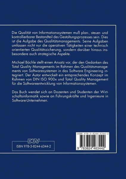 1 Qualitätsmanagement in der Wirtschaftsinformatik.- 1.1 Motivation und Zielsetzung.- 1.2 Gang der Untersuchung.- 2 Management und Qualität im Unternehmen.- 2.1 Management.- 2.2 Qualität.- 2.3 Bausteine des Qualitätsmanagements.- 3 Softwareentwicklung als unternehmensprozess.- 3.1 Organisationstheoretische Einordnung.- 3.2 Wirtschaftsgut Software.- 3.3 Softwaremanagement.- 3.4 Softwarequalität.- 4 Anforderungen an ein Modell des Softwarequalitätsmanagements.- 4.1 Qualitätsnormen für Software.- 4.2 Allgemeine Anforderungen der Qualitätsnorm DIN EN ISO 9001.- 4.3 Mindestanforderungen an ein Qualitätsmanagementkonzept.- 5 Konzept Eines Quantitativen Softwarequalitätsmanagements.- 5.1 Überblick.- 5.2 Qualitätsmodelle.- 5.3 Softwaremetrische Grundlagen.- 5.4 Verfahren zur Ableitung von Qualitätsmodellen.- 5.5 QEG-Verfahren.- 5.6 Qualitätskosten.- 6 Zusammenfassung und Ausblick.