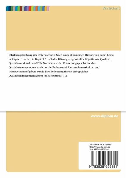 Nach einer allgemeinen Hinführung zum Thema in Kapitel 1 stehen in Kapitel 2 nach der Klärung ausgewählter Begriffe wie Qualität, Qualitätsmerkmale und DIN Norm sowie der Entstehungsgeschichte des Qualitätsmanagements zunächst die Fachtermini Unternehmenskultur und Managementaufgaben sowie ihre Bedeutung für ein erfolgreiches Qualitätsmanagementsystem im Mittelpunkt.