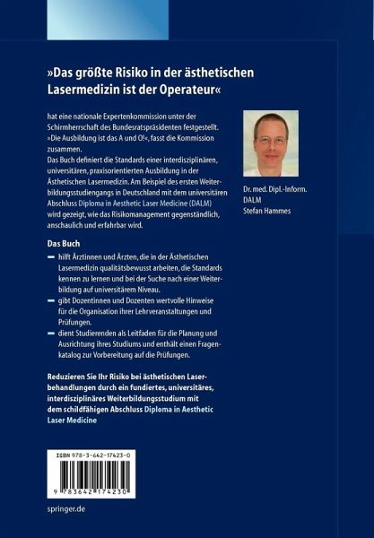 Das Buch definiert die Standards einer interdisziplinären, universitären, praxisorientierten Ausbildung in der Ästhetischen Lasermedizin. Am Beispiel des ersten Weiterbildungsstudienganges in Deutschland mit dem universitären Abschluss Diploma in Aesthetic Laser Medicine (DALM) wird gezeigt, wie das Risikomanagement konkrete Form annehmen kann.