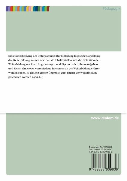 Der Einleitung folgt eine Darstellung der Weiterbildung an sich. Als zentrale Inhalte stellen sich die Definition der Weiterbildung mit ihren Abgrenzungen und Eigenschaften, ihren Aufgaben und Zielen dar, wobei verschiedene Interessen an der Weiterbildung erörtert werden sollen, so daß ein grober Überblick zum Thema der Weiterbildung geschaffen werden kann.