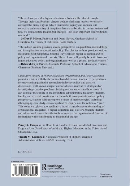 Qualitative Inquiry in Higher Education Organization and Policy Research provides readers with the theoretical foundations and innovative perspectives for undertaking qualitative research to influence policy and practice discussions. Well-known chapter authors discuss innovative strategies for investigating complex problems, helping readers understand how research can consider the culture of the institution, administrative hierarchy, students, faculty, and external constituencies. From both an organizational and policy perspective, chapter pairings explore a range of methodologies, including ethnography, case study, critical qualitative inquiry, and the notion of "grit." This volume explores how qualitative inquiry can advance understanding of organizational inequities in higher education, and it offers graduate students and educational researchers the tools to improve the organizational function of institutions while contributing to meaningful change.