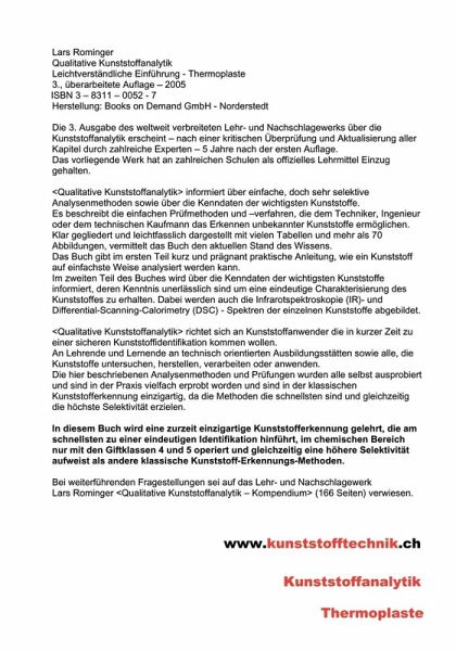 Die 3. Ausgabe des weltweit verbreiteten Lehr- und Nachschlagewerks über die Kunststoffanalytik erscheint - nach einer kritischen Überprüfung und Aktualisierung aller Kapitel durch zahlreiche Experten - 5 Jahre nach der ersten Auflage. Das vorliegende Werk hat an zahlreichen Schulen als offizielles Lehrmittel Einzug gehalten."Qualitative Kunststoffanalytik" informiert über einfache und komplexere Analysenmethoden sowie über die Kenndaten der wichtigsten Kunststoffe. Klar gegliedert und leichtfasslich dargestellt mit vielen Übersichtstabellen und mehr als 70 Abbildungen, vermittelt das Buch den aktuellen Stand des Wissens.Das Buch gibt im ersten Teil kurz und prägnant praktische Anleitung, wie ein Kunststoff auf einfachste Weise analysiert werden kann. Im zweiten Teil des Buches wird über die Kenndaten der wichtigsten Kunststoffe informiert, deren Kenntnis unerlässlich sind um eine eindeutige Charakterisierung des Kunststoffes zu erhalten. Dabei werden auch Infrarot-spektroskopie (IR)- und Differential-Scanning-Calorimetry (DSC) - Spektren der einzelnen Kunststoffe abgebildet."Qualitative Kunststoffanalytik" richtet sich an Kunststoffanwender die in kurzer Zeit zu einer sicheren Kunststoffidentifikation kommen wollen. An Lehrende und Lernende an technisch orientierten Ausbildungsstätten sowie alle, die Kunststoffe untersuchen, herstellen, verarbeiten oder anwenden. In diesem Buch wird eine zurzeit einzigartige Kunststofferkennung gelehrt, die am schnellsten zu einer eindeutigen Identifikation hinführt, im chemischen Bereich nur mit den Giftklassen 4 und 5 operiert und gleichzeitig eine höhere Selektivität aufweist als andere klassische Kunststoff-Erkennungs-Methoden. Gegengelesen von Dr. chem. Vladimir Purghart.
