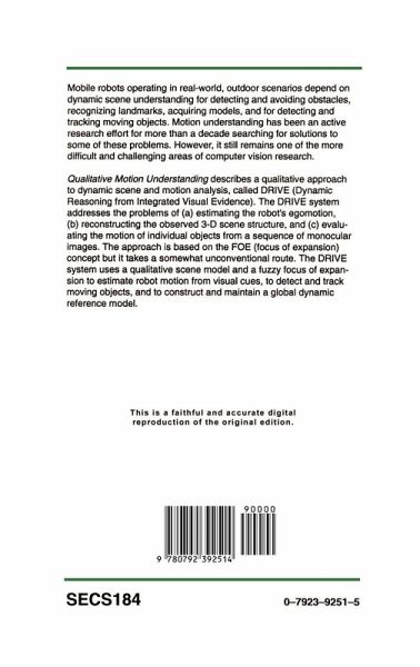 Qualitative Motion Understanding describes a qualitative approach to dynamic scene and motion analysis, called DRIVE (Dynamic Reasoning from Integrated Visual Evidence). The DRIVE system addresses the problems of (a) estimating the robot's egomotion, (b) reconstructing the observed 3-D scene structure; and (c) evaluating the motion of individual objects from a sequence of monocular images. The approach is based on the FOE (focus of expansion) concept, but it takes a somewhat unconventional route. The DRIVE system uses a qualitative scene model and a fuzzy focus of expansion to estimate robot motion from visual cues, to detect and track moving objects, and to construct and maintain a global dynamic reference model.