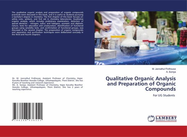 The qualitative organic analysis and preparation of organic compounds practicals were discussed in this book, and it is useful to students pursuing a bachelor's degree in chemistry. The first chapter of this book focuses on safety rules, symbols, and first aid in chemistry laboratories. Qualitative organic analysis, which includes preliminary examination, detection of special elements - nitrogen, sulfur, and halogens, aromatic and aliphatic nature, tests for saturation and unsaturation, identification of functional groups using solubility tests, and confirmation of functional groups, was discussed in the second chapter. The preparation of organic compounds and separation and purification techniques were deliberated concisely in the third and fourth chapters.