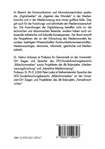 Vorwort.- Grundpositionen.- Konstituenten einer Medienwissenschaft.- Für eine integrierte Medien- und Kommunikationswissenschaft.- Mediale Kommunikationsdynamik.- Television studies shifting disciplinary status: Anglo-American developments.- Medienwandel.- Medienwandel und Wandel durch Medien. Einige Anmerkungen.- 'Linksgeneigte Litfaßsäule' oder 'Coca-Cola-Fernsehen'? Perspektiven des Medienwandels: die Einführung kommerziellen Fernsehens in Frankreich 1985/1986.- Medienwandel - Persistenz - Authentizität. Anthropologische und medientheoretische Randbemerkungen zur Diskussion um den 'qualitativen Medienwandel'.- Fernsehen und Neue Medien - eine ökonomische Einschätzung.- Perspektiven.- Bildschirmmedium Internet? Ein Blick in die Turingsche Galaxis.- Drei Simulationsmodelle.- Digitaltechnik - Digitalmedien - Digitalkultur. Für eine transdisziplinäre Kooperation angesichts neuer wissenschaftlicher Problemfelder.- Vom Werk des Autors zum Werk des Nutzers.- "Jumps - Cuts - Links". Ästhetische Antizipationen der neuen Medien.