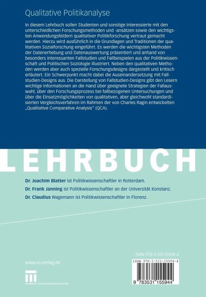 In diesem Lehrbuch sollen Studenten und sonstige Interessierte mit den unterschiedlichen Forschungsmethoden und -ansätzen sowie den wichtigsten Anwendungsfeldern qualitativer Politikforschung vertraut gemacht werden. Hierzu wird ausführlich in die Grundlagen und Traditionen der qualitativen Sozialforschung eingeführt. Es werden die wichtigsten Methoden der Datenerhebung und Datenauswertung präsentiert und anhand von besonders interessanten Fallstudien und Fallbeispielen aus der Politikwissenschaft und Politischen Soziologie illustriert. Neben den qualitativen Methoden werden aber auch spezielle Forschungsdesigns dargestellt und kritisch erläutert. Ein Schwerpunkt macht dabei die Auseinandersetzung mit Fallstudien-Designs aus. Die Darstellung von Fallstudien-Designs gibt den Lesern wichtige Informationen an die Hand über geeignete Strategien der Fallauswahl, über den Forschungsprozess bei fallbezogenen Untersuchungen und über die Einsatzmöglichkeiten von qualitativen, aber gleichwohl standardisierten Vergleichsverfahren im Rahmen der von Charles Ragin entwickelten "Qualitative Comparative Analysis" (QCA).