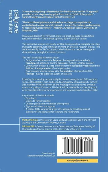 'It was daunting doing a dissertation for the first time and the 7P approach provided a clear step-by-step guide from start to finish of the project' - Sarah, Undergraduate Student, Bath University, UK 'The text offered guidance and aided me as I began to negotiate the contested and messy world of research. This is a book that is simultaneously challenging and rewarding, a must for students endeavouring to research physical culture' - Matthew, Graduate Student, University of Maryland, USA