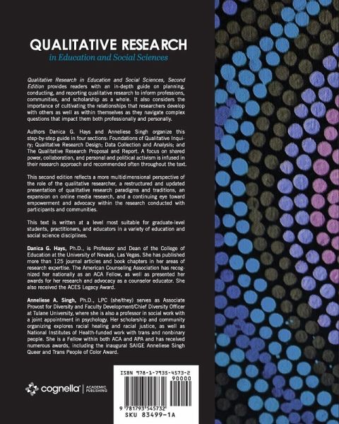 Qualitative Research in Education and Social Sciences, Second Edition provides readers with an in-depth guide on planning, conducting, and reporting qualitative research to inform professions, communities, and scholarship as a whole. It also considers the importance of cultivating the relationships that researchers develop with others as well as within themselves as they navigate complex questions that impact them both professionally and personally. Authors Danica G. Hays and Anneliese Singh organize this step-by-step guide in four sections: Foundations of Qualitative Inquiry; Qualitative Research Design; Data Collection and Analysis; and The Qualitative Research Proposal and Report. A focus on shared power, collaboration, and personal and political activism is infused in their research approach and recommended often throughout the text. This second edition reflects a more multidimensional perspective of the role of the qualitative researcher, a restructured and updated presentation of qualitative research paradigms and traditions, an expansion on online media research, and a continuing eye toward empowerment and advocacy within the research conducted with participants and communities. This text is written at a level most suitable for graduate-level students, practitioners, and educators in a variety of education and social science disciplines.