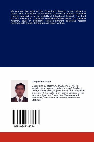 We can see that most of the Educational Research is not relevant at present time. Education is a social science so we should adopted qualitative research approaches for the usability of Educational Research. This book contains meaning of qualitative research,definition,nature of qualitative research, issues in qualitative research, different qualitative research methods, data analysis techniques and report writing.