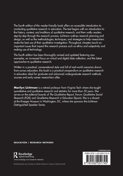 The fourth edition of this reader-friendly book offers an accessible introduction to conducting qualitative research in education. The text begins with an introduction to the history, context, and traditions of qualitative research, and then walks readers step-by-step through the research process. Lichtman outlines research planning and design, as well as the methodologies, techniques, and strategies to help researchers make the best use of their qualitative investigation. Throughout, chapters touch on important issues that impact this research process such as ethics and subjectivity and making use of technology.