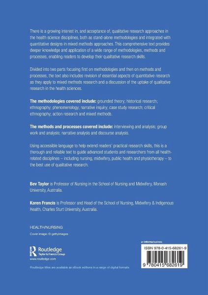 Part 1: Methodologies 1. Introduction Beverley Taylor 2. Grounded Theory Beverley Taylor 3. Historical Research Karen Francis 4. Ethnography Karen Francis 5. Phenomenology Beverley Taylor 6. Narrative Inquiry Beverley Taylor 7. Case Study Research Beverley Taylor 8. Feminisms Beverley Taylor 9. Action Research Karen Francis 10. Mixed Methods Research Beverley Taylor Part 2: Methods and Processes 11. Introduction Beverley Taylor 12. Interviewing And Analysis Beverley Taylor 13. Group Work and Analysis Beverley Taylor 14. Narrative Analysis Beverley Taylor 15. Discourse Analysis Karen Francis 16. Creative Forms Of Qualitative Data Collection & Analysis Beverley Taylor 17. Uptake of Qualitative Research in Health Sciences Karen Francis