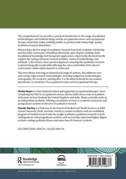 This new edition, featuring an international range of authors, also addresses new and cutting-edge research methodologies, including Indigenous methodologies, netnography, the visual arts, and Big data. It is the ideal textbook for any student, practitioner, or researcher of occupational science and occupational therapy.
