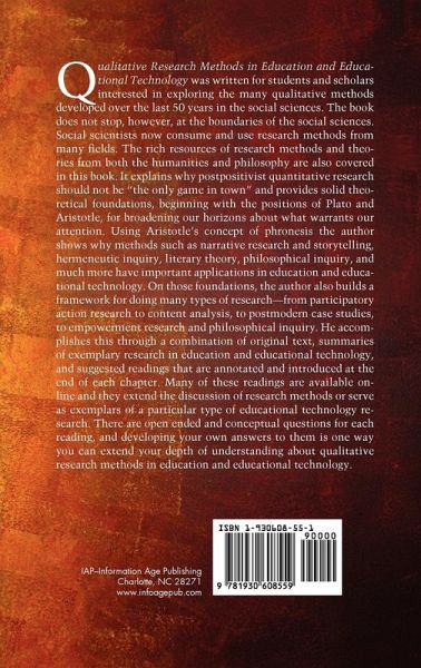Qualitative Research Methods in Education and Educational Technology was written for students and scholars interested in exploring the many qualitative methods developed over the last 50 years in the social sciences. The book does not stop, however, at the boundaries of the social sciences. Social scientists now consume and use research methods from many fields. The rich resources of research methods and theories from both the humanities and philosophy are also covered in this book. It explains why postpositivist quantitative research should not be ¿the only game in town¿ and provides solid theoretical foundations, beginning with the positions of Plato and Aristotle, for broadening our horizons about what warrants our attention. Using Aristotle¿s concept of phronesis the author shows why methods such as narrative research and storytelling, hermeneutic inquiry, literary theory, philosophical inquiry, and much more have important applications in education and educational technology. On those foundations, the author also builds a framework for doing many types of research ¿ from participatory action research to content analysis, to postmodern case studies, to empowerment research and philosophical inquiry. He accomplishes this through a combination of original text, summaries of exemplary research in education and educational technology, and suggested readings that are annotated and introduced at the end of each chapter. Many of these readings are available online and they extend the discussion of research methods or serve as exemplars of a particular type of educational technology research. There are open ended and conceptual questions for each reading, and developing your own answers to them is one way you can extend your depth of understanding about qualitative research methods in education and educational technology.