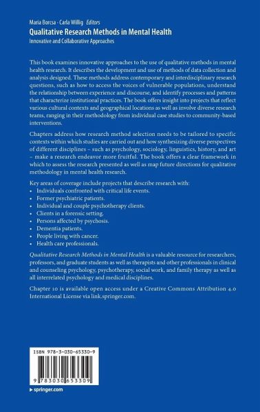 This book examines innovative approaches to the use of qualitative methods in mental health research. It describes the development and use of methods of data collection and analysis designed. These methods address contemporary and interdisciplinary research questions, such as how to access the voices of vulnerable populations, understand the relationship between experience and discourse, and identify processes and patterns that characterize institutional practices. The book offers insight into projects that reflect various cultural contexts and geographical locations as well as involve diverse research teams, ranging in their methodology from individual case studies to community-based interventions.