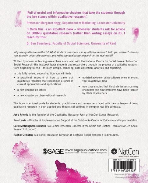 Written by a team of leading researchers associated with NatCen Social Research (the National Centre for Social Research) this textbook leads students and researchers through the entire process of qualitative research from beginning to end - moving through design, sampling, data collection, analysis and reporting. In this fully revised second edition you will find: