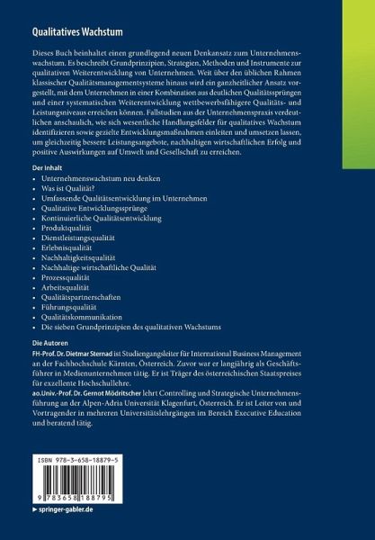 Dieses Buch beinhaltet einen grundlegend neuen Denkansatz zum Unternehmenswachstum. Es beschreibt Grundprinzipien, Strategien, Methoden und Instrumente zur qualitativen Weiterentwicklung von Unternehmen. Weit über den üblichen Rahmen klassischer Qualitätsmanagementsysteme hinaus wird ein ganzheitlicher Ansatz vorgestellt, mit dem Unternehmen in einer Kombination aus deutlichen Qualitätssprüngen und einer systematischen Weiterentwicklung wettbewerbsfähigere Qualitäts- und Leistungsniveaus erreichen können. Fallstudien aus der Unternehmenspraxis verdeutlichen anschaulich, wie sich wesentliche Handlungsfelder für qualitatives Wachstum identifizieren sowie gezielte Entwicklungsmaßnahmen einleiten und umsetzen lassen, um gleichzeitig bessere Leistungsangebote, nachhaltigen wirtschaftlichen Erfolg und positive Auswirkungen auf Umwelt und Gesellschaft zu erreichen.