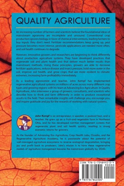 An increasing number of farmers and scientists believe the foundational ideas of mainstream agronomy are incomplete and unsound. Conventional crop production ignores biology in favor of chemical interventions, leading farmers to buy inputs they don't need. Fertilizer recommendations keep going up, pest pressure becomes more intense, pesticide applications are needed more often, and soil health continues to degrade. However, innovative growers and researchers are beginning to think differently about production agriculture systems. They have developed practices that regenerate soil and plant health and that deliver much better results than mainstream methods. Using these principles, growers are able to decrease fertilizer applications, reduce disease and insect pressure, hold more water in the soil, improve soil health, and grow crops that are more resilient to climatic extremes, increasing farm profitability immediately. As a leading agronomist and teacher, John Kempf has implemented regenerative agricultural systems on millions of acres across many different crop types and growing regions with his team at Advancing Eco Agriculture. In Quality Agriculture, John interviews a group of growers, consultants, and scientists who describe how to think and farm differently in order to produce exceptional results in the field. Their remarkable insights will challenge you, encourage you, and inspire gratitude and joy for the rewards of working with natural systems.