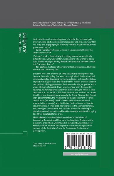 'An innovative and outstanding piece of scholarship on forest policy, environmental politics, international relations and democracy. Written in a lively and engaging style, this study makes a major contribution to governance theory.' - David Humphreys, Senior Lecturer in Environmental Policy, The Open University, UK 'Cadman's book is theoretically rich, highly innovative, empirically exhaustive and very well written. I urge anyone who wishes to gain a solid understanding of the key debates and empirical research to read this fine piece of work.' - Ben Cashore, Professor of Environmental Governance and Political Science, Yale University, USA