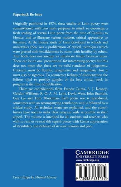 Originally published in 1974, these studies of Latin poetry were commissioned with two main purposes in mind: to encourage a fresh reading of several Latin poets from the time of Catullus to Horace, and to illustrate various, critical approaches to literature. As the literary study of Latin developed in schools and universities there was a proliferation of critical techniques, which were greeted with bewilderment by some, with hostility by others. This book does not attempt to adjudicate finally between them. There can be no one 'prescription' for interpreting poetry; but this does not mean that there are no valid standards of judgement. Criticism must be flexible, imaginative and sympathetic, but it must also be rigourous. To counteract feelings of disorientation the editors tried to provide samples of the best critical work in progress at the time of publication.