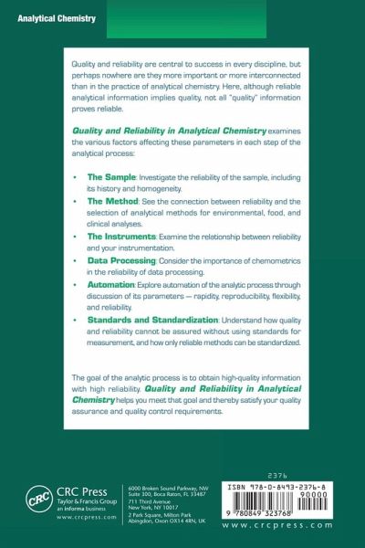 Quality and reliability are central to success in every discipline, but perhaps nowhere are they more important or more interconnected than in the practice of analytical chemistry. Here, although reliable analytical information implies quality, not all "quality" information proves reliable. Quality and Reliability in Analytical Chemistry examines the various factors affecting these parameters in each step of the analytical process: The Sample: Investigate the reliability of the sample, including its history and homogeneity. The Method: See the connection between reliability and the selection of analytical methods for environmental, food, and clinical analyses. The Instruments: Examine the relationship between reliability and your instrumentation. Data Processing: Consider the importance of chemometrics in the reliability of data processing. Automation: Explore automation of the analytic process through discussion of its parameters - rapidity, reproducibility, flexibility, and reliability. Standards and Standardization: Understand how quality and reliability cannot be assured without using standards for measurement and how only reliable methods can be standardized. The goal of the analytic process is to obtain high quality information with high reliability. Quality and Reliability in Analytical Chemistry helps you meet that goal and thereby satisfy your quality assurance and quality control requirements.