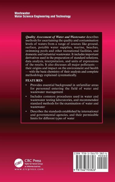 Water contamination is measured by the level of pollutants present in a sample. Regular analytical estimation of wastewater is the answer. This manual emphasizes the importance of water purity for drinking and domestic purposes, different types of water and their utilization in various activities, the water quality requirements and criteria of International and Governmental Agencies, and simple estimation procedures and the significance of each analytical test. Laboratory Manual for the Quality Assessment of Water and Wastewater describes methods for ascertaining the quality and contamination levels of waters from a range of sources like ground, surface, potable water supplies, marine, beaches, swimming pools and other recreational facilities, and domestic and industrial wastewater. It includes important derivatives used in the preparation of standard solutions, data analysis, interpretation and units of expressions of the results. It also discusses all major pollutants - their origins and impact on the environment and health - with the basic chemistry of their analysis and complete methodology explained systematically. TOC:Introduction. Safety in the Laboratory. Quality Control and Quality Assurance. Types of Water Samples - Sources and Quality Assessment. Water Quality Requirements and Standards. Estimations of Water and Wastewater Quality.