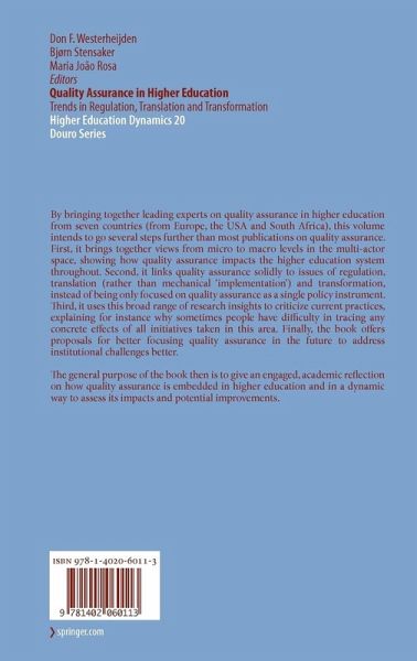 By bringing together leading experts on quality assurance in higher education from seven countries (from Europe, the USA and South Africa), this volume intends to go several steps further than most publications on quality assurance. First, it brings together views from micro to macro levels in the multi-actor space, showing how quality assurance impacts the higher education system throughout. Second, it links quality assurance solidly to issues of regulation, translation (rather than mechanical 'implementation') and transformation, instead of being only focused on quality assurance as a single policy instrument. Third, it uses this broad range of research insights to criticize current practices, explaining for instance why sometimes people have difficulty in tracing any concrete effects of all initiatives taken in this area. Finally, the book offers proposals for better focusing quality assurance in the future to address institutional challenges better.