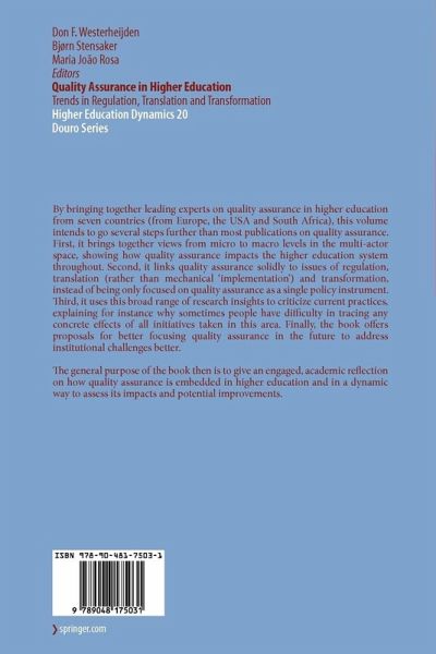 By bringing together leading experts on quality assurance in higher education from seven countries (from Europe, the USA and South Africa), this volume intends to go several steps further than most publications on quality assurance. First, it brings together views from micro to macro levels in the multi-actor space, showing how quality assurance impacts the higher education system throughout. Second, it links quality assurance solidly to issues of regulation, translation (rather than mechanical 'implementation') and transformation, instead of being only focused on quality assurance as a single policy instrument. Third, it uses this broad range of research insights to criticize current practices, explaining for instance why sometimes people have difficulty in tracing any concrete effects of all initiatives taken in this area. Finally, the book offers proposals for better focusing quality assurance in the future to address institutional challenges better.
