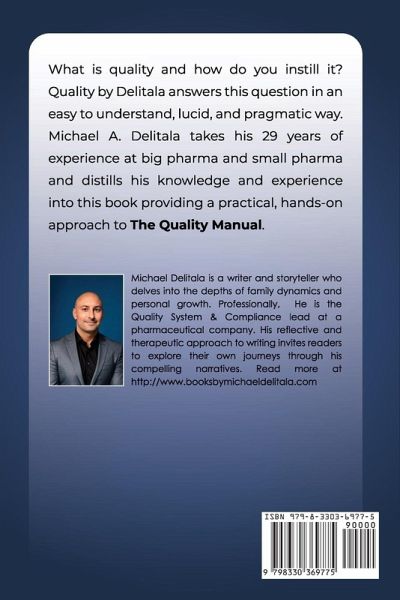 What is quality and how do you instill it? Quality by Delitala answers this question in an easy to understand, lucid, and pragmatic way. Michael A. Delitala takes his 29 years of experience at big pharma and small pharma and distills his knowledge and experience into this book providing a practical, hands-on approach to The Quality Manual.