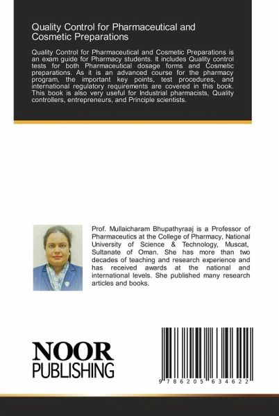 Quality Control for Pharmaceutical and Cosmetic Preparations is an exam guide for Pharmacy students. It includes Quality control tests for both Pharmaceutical dosage forms and Cosmetic preparations. As it is an advanced course for the pharmacy program, the important key points, test procedures, and international regulatory requirements are covered in this book. This book is also very useful for Industrial pharmacists, Quality controllers, entrepreneurs, and Principle scientists.