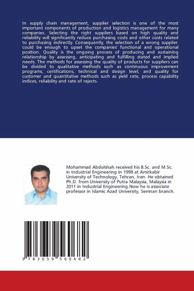 In supply chain management, supplier selection is one of the most important components of production and logistics management for many companies. Selecting the right suppliers based on high quality and reliability will significantly reduce purchasing costs and other costs related to purchasing indirectly. Consequently, the selection of a wrong supplier could be enough to upset the companies' functional and operational position. Quality is the ongoing process of producing and sustaining relationship by assessing, anticipating and fulfilling stated and implied needs. The methods for assessing the quality of products for suppliers can be divided to qualitative methods such as continuous improvement programs, certifications, technical and design level, and quality for customer and quantitative methods such as yield rate, process capability indices, reliability and rate of rejects.
