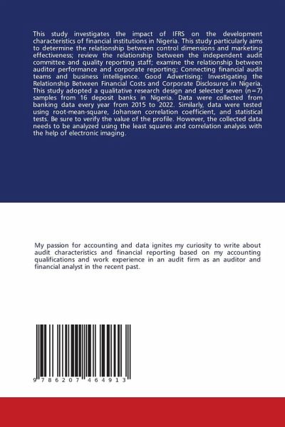This study investigates the impact of IFRS on the development characteristics of financial institutions in Nigeria. This study particularly aims to determine the relationship between control dimensions and marketing effectiveness; review the relationship between the independent audit committee and quality reporting staff; examine the relationship between auditor performance and corporate reporting; Connecting financial audit teams and business intelligence. Good Advertising; Investigating the Relationship Between Financial Costs and Corporate Disclosures in Nigeria. This study adopted a qualitative research design and selected seven (n=7) samples from 16 deposit banks in Nigeria. Data were collected from banking data every year from 2015 to 2022. Similarly, data were tested using root-mean-square, Johansen correlation coefficient, and statistical tests. Be sure to verify the value of the profile. However, the collected data needs to be analyzed using the least squares and correlation analysis with the help of electronic imaging.
