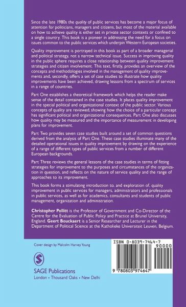 Since the late 1980s the quality of public services has become a major focus of attention for politicians, managers and citizens, but surprisingly there has been little material with a truly European focus. This book remedies this absence. Part One provides a theoretical framework which helps the reader make sense of the detail contained in the later case studies. It also locates quality improvement in the special political and organizational context of the public sector. It shows how choosing a particular concept of quality has significant political and organizational consequences and also discusses how quality may be measured. In Part Two seven case studies illuminate detailed operational issues in quality improvement by drawing on the experience of a range of different types of public services from a number of countries. The third part reviews the general lessons of the case studies in terms of fitting strategies for improvement to the purposes and circumstances of the organization in question, and reflects upon the nature of service quality and the range of approaches to its improvement.