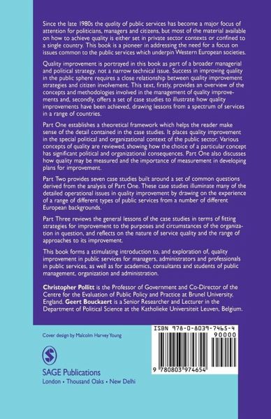 Introduction PART ONE: DEFINITION AND OPERATIONALIZATION Defining Quality - Christopher Pollitt and Geert Bouckaert Measuring Quality - Geert Bouckaert PART TWO: CASE STUDIES Quality Measurement and Quality Assurance in European Higher Education - Frans van Vught and Don F Westerheijden Quality in the French Public Service - Sylvie Trosa Quality Improvement in German Local Government - Helmut Klages et al Quality Improvement in Local Service Contracts - Lucy Gaster Environmental Services in Harlow Quality in Swedish Higher Education - Hellen Westlund A Pilot Study Costing Non-Conformance at an NHS Hospital - Richard Joss A Pilot Study Quality Improvement in the Dutch Department of Defence - Nico Mol Enhancing Quality in the Police Service - Stephen Hanney Leicestershire Constabulary PART THREE: OVERVIEW Improvement Strategies - Christopher Pollitt Concluding Reflections - Geert Bouckaert