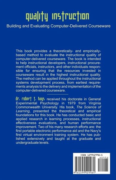 This book provides a theoretically- and empirically-based method to evaluate the instructional quality of computer-delivered courseware. The book is intended to help instructional developers, instructional procurement officials, instructors, and other individuals responsible for ensuring that the resources invested in courseware result in the highest instructional quality. The method can be applied throughout the instructional systems development process, from earliest requirements analysis to the delivery and implementation of the computer-delivered courseware.