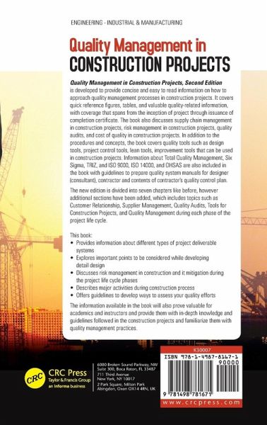 The first edition published in 2010. The response was encouraging and many people appreciated a book that was dedicated to quality management in construction projects. Since it published, ISO 9000: 2008 has been revised and ISO 9000: 2015 has published. The new edition will focus on risk-based thinking which must be considered from the beginning and throughout the project life cycle. There are quality-related topics such as Customer Relationship, Supplier Management, Risk Management, Quality Audits, Tools for Construction Projects, and Quality Management that were not covered in the first edition. Furthermore, some figures and tables needed to be updated to make the book more comprehensive.